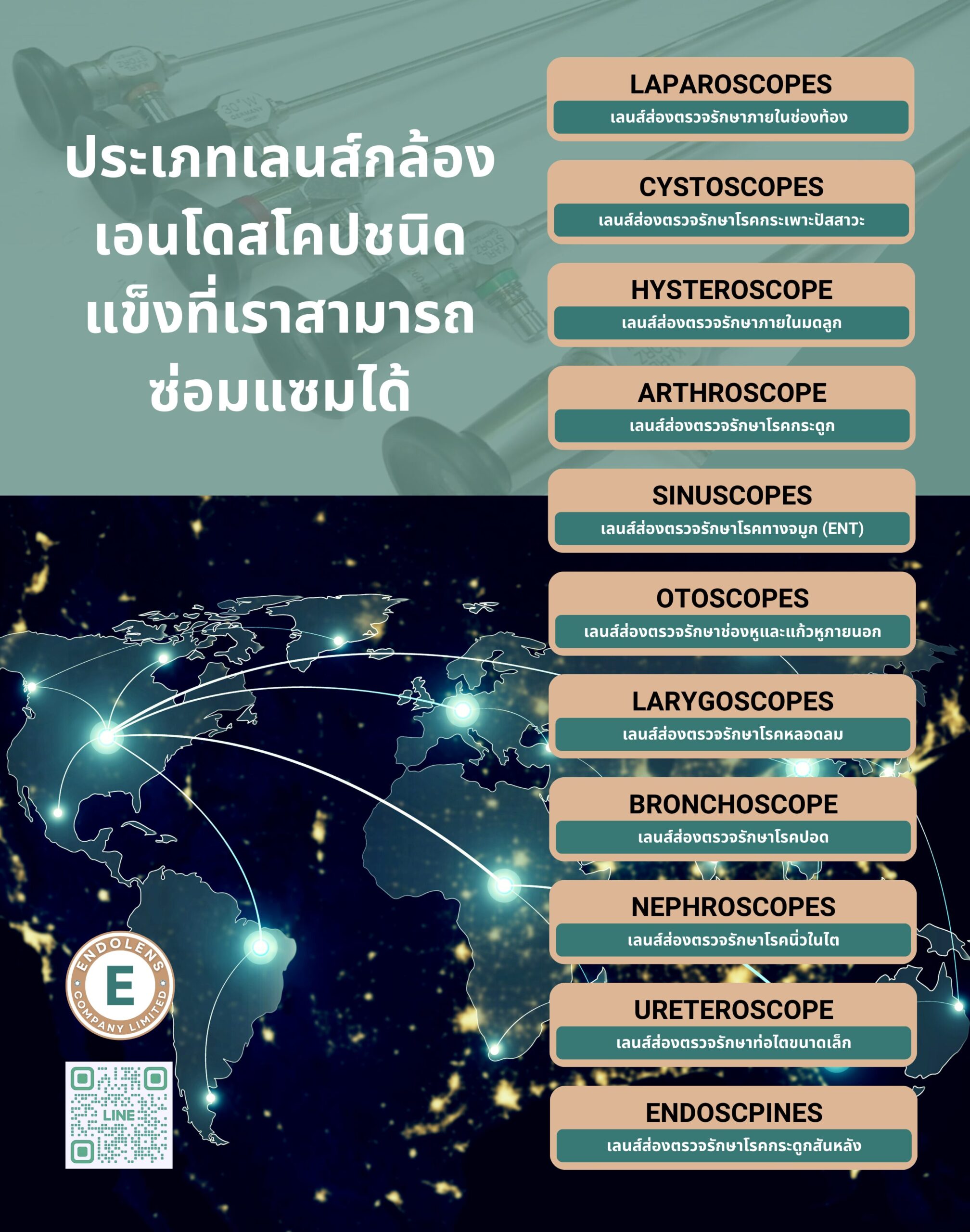บริษัท เอ็นโดเลนส์ จำกัด เชี่ยวชาญด้านการซ่อมแซมและบำรุงรักษากล้องเอนโดสโคปชนิดแข็งและเลนส์ผ่าตัด ด้วยประสบการณ์ตรงมากกว่า 25 ปี และได้รับความไว้วางใจจากโรงพยาบาลกว่า 100 แห่งทั่วประเทศไทยและเอเชียตะวันออกเฉียงใต้ ทีมวิศวกรผู้เชี่ยวชาญของเรามอบบริการดังต่อไปนี้: